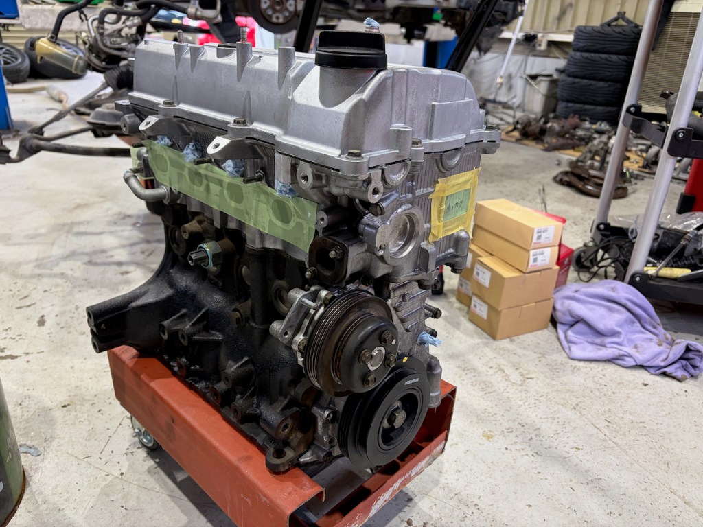 通常、他店ではリビルトエンジンメーカーが作成したエンジンに載せ替えるのが一般的ですが、信頼性の観点から当店では自社でリビルトしたエンジンをストックしていますので、そのエンジンに載せ替えます。