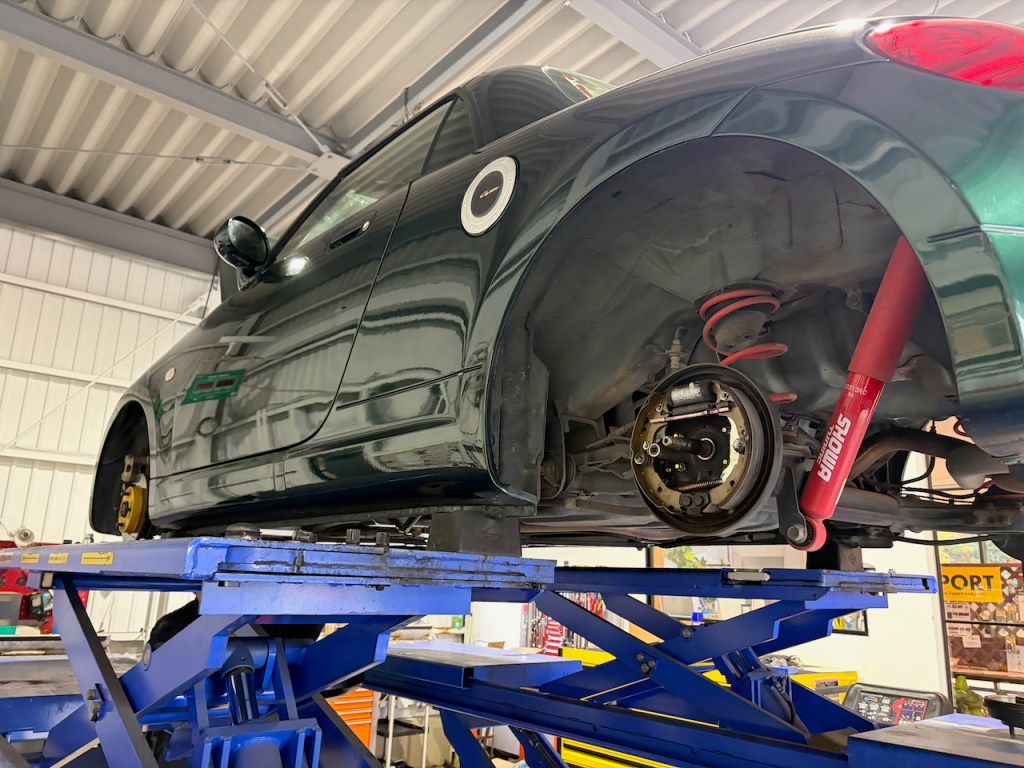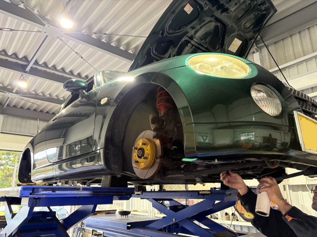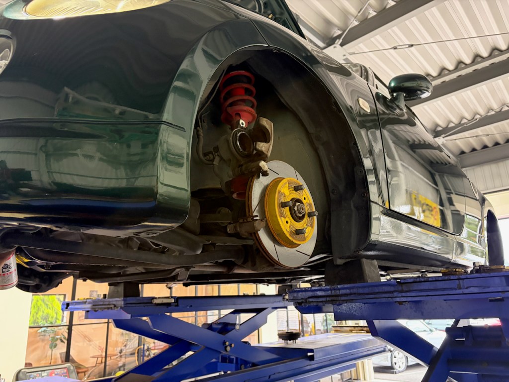 こちらのストライプが特徴的な青コペンさんはブレーキの整備です。
