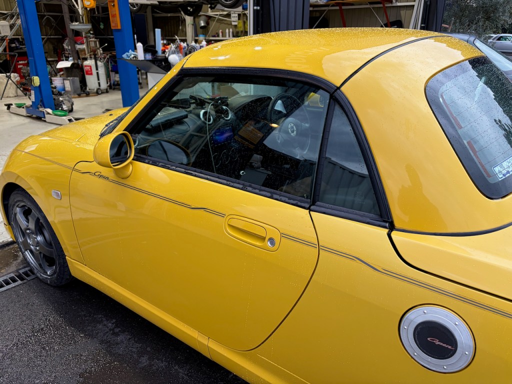 先日ご紹介したドアミラーとドアハンドル、ルーフ塗装のコペンさん。車両に取り付けして細かい調整も済ませて作業完了です!