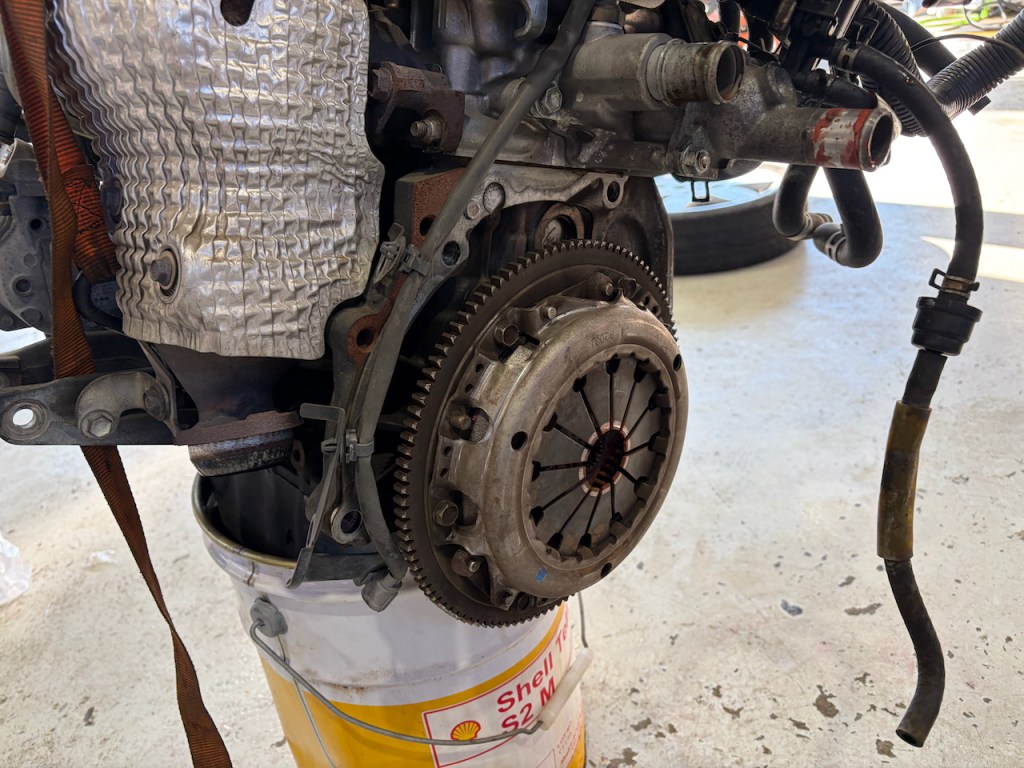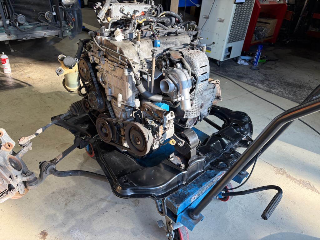 タービン交換&クラッチ交換のコペンさんは単体での作業が終わり、これから車体とドッキング。
